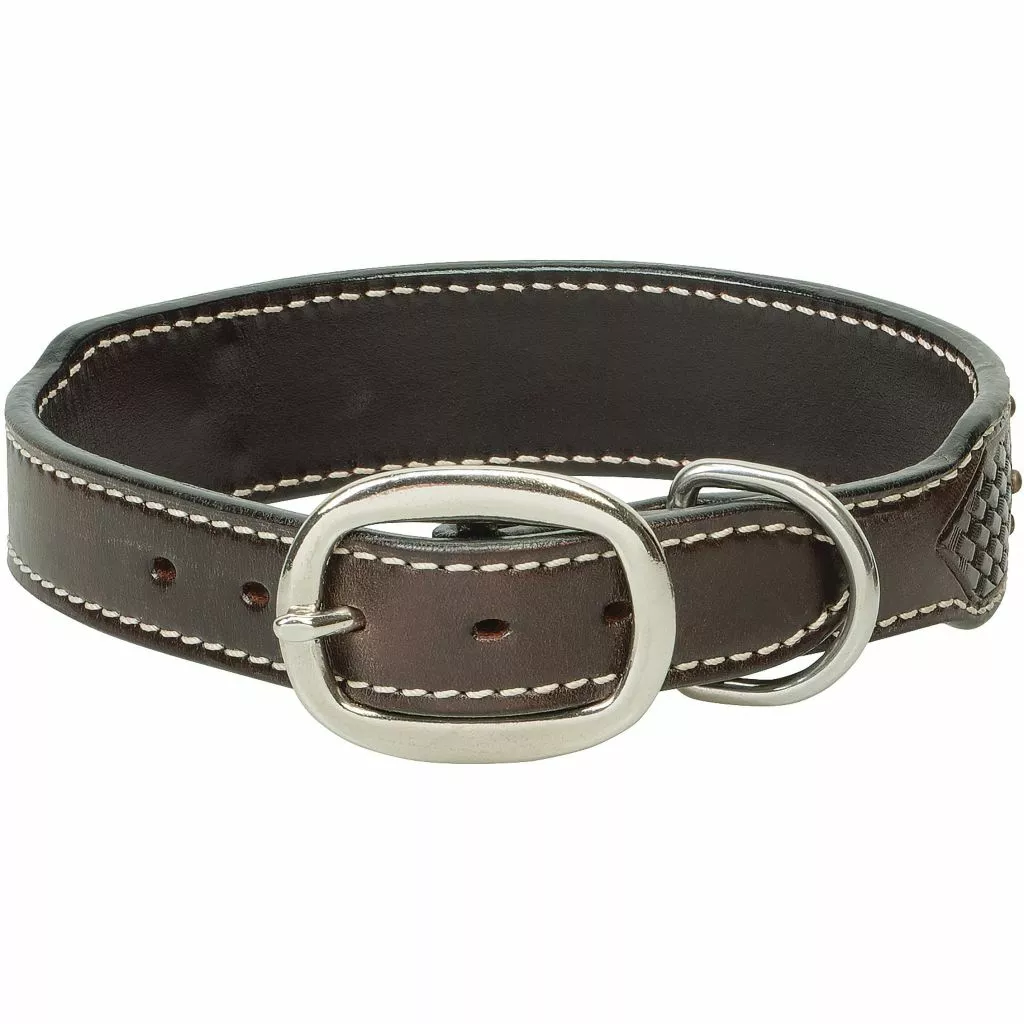 - Basketweave sog collar is constructed from dark brown oiled leather with basketweave tooling