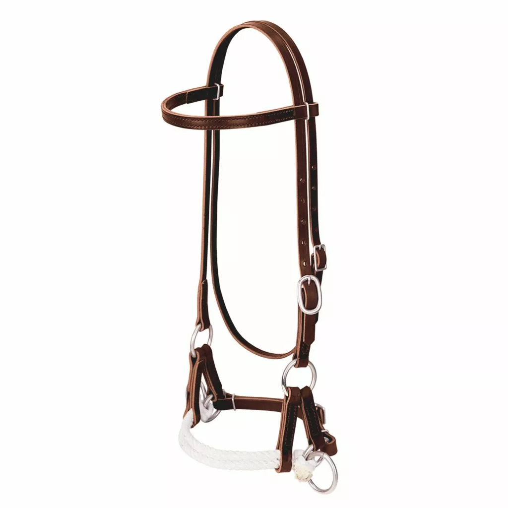 - Second ring rein attachment allows the rope nose band to roll across the nose