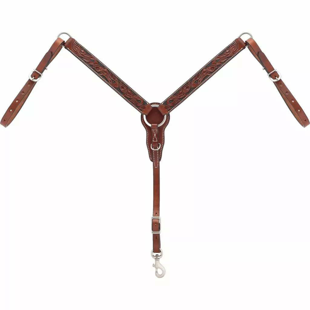 Crafted from chestnut leather and carved with an intricate floral design highlighted with black stain. Features non-rust stainless steel hardware. Pony Size