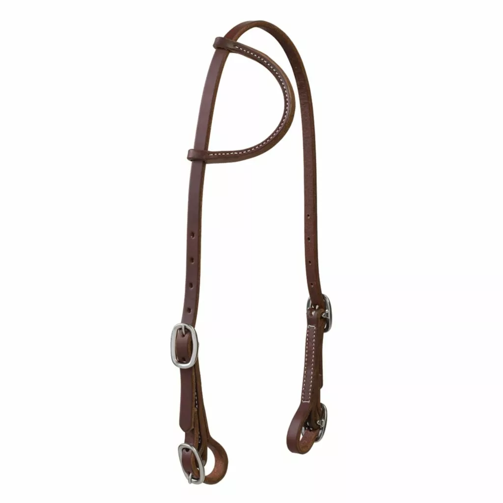 Extra heavy harness leather is dipped in oil, dressed with butter and hand rubbed for the ultimate in performance and a rich golden chestnut color. This easy-to-position 5/8 in. sliding ear headstall features lower buckle placement for your horse’s comfort and buckle bit ends for easy bit changes. Ideal for trail, working, and everyday use. Non-rust stainless steel hardware.